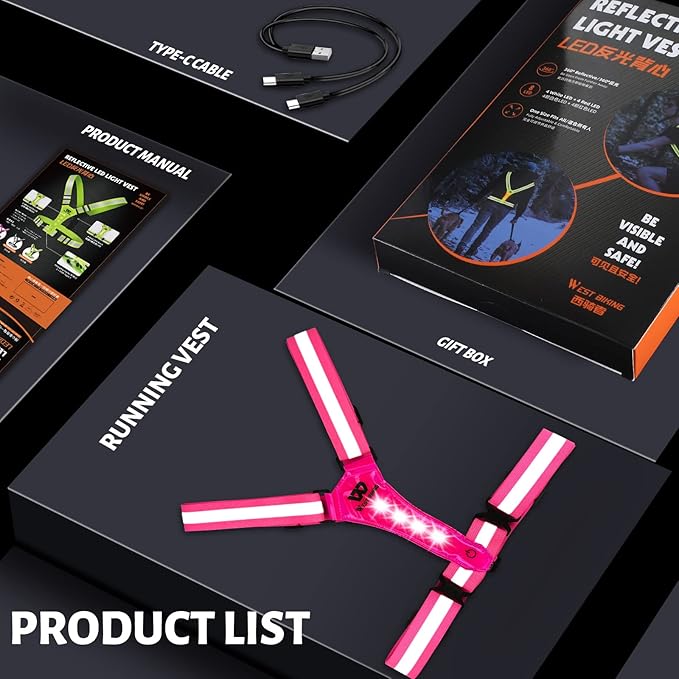 West Biking Running Vest Light - Led Running Reflective Gear for Walking at Night, High Visibility Night Rechargeable Light Up Running Vest, Adjustable Running Lights for Runners