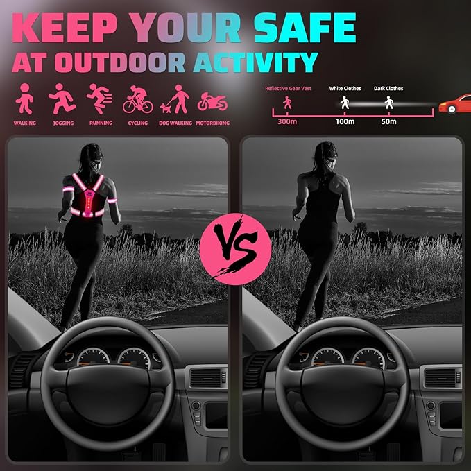 - High Visible Reflective Gear - We improve night running vest with incredible LED lights, our safety reflective vests which visible from 1000 feet away. we also equip with reflective bands for wrist, arm. Excellent 360 Degree high visibility LED reflective gear keep you safe in all weather conditions(rain, fog, dark) at day or night. Long range reflection and all-angle body coverage ensures you and your loved ones are seen in vehicle headlights from any direction