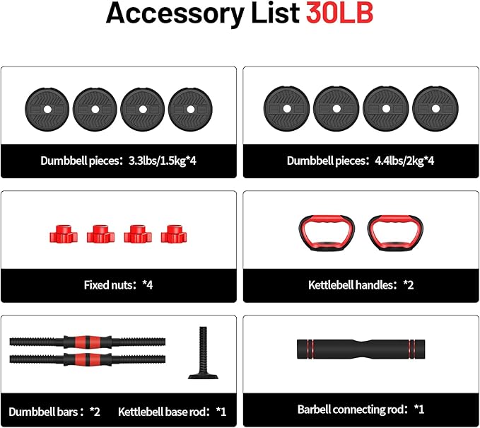- WEIGHT PACKAGE LIST - 30 lbs fitness dumbbells include: 4 × 4.4lbs weight plates, 4x3.3lbs weight plates,4x dumbbell nuts,2 × kettlebell handles, 1 × barbell connecting rod ,1 × kettlebell base rod and 2x dumbbell bars. You can choose different weights according to your own preferences to meet the intensity needs of you and your family at different stages of exercise