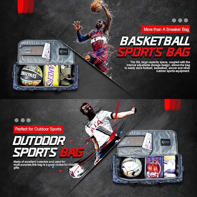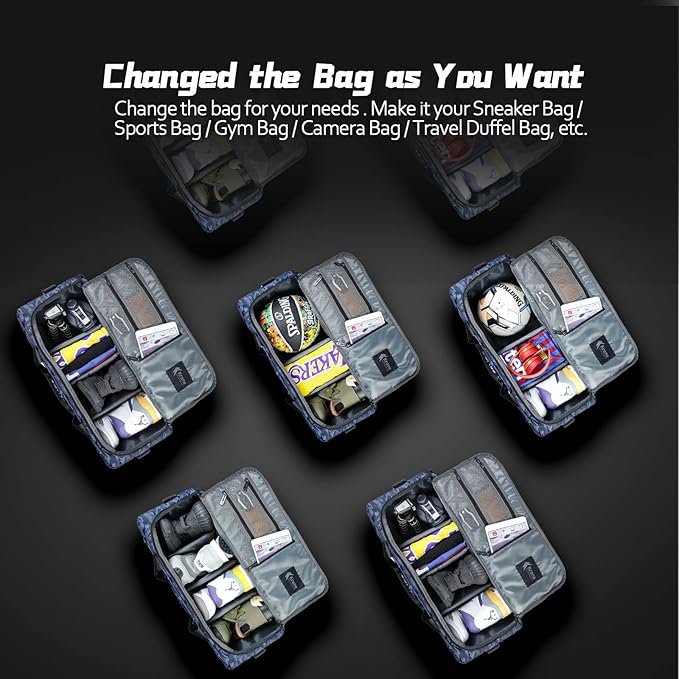 - WIDE USAGE: This fashion travel duffle bag is not only used as a shoe suitcase for travel. Adjusting the 3 dividers inside, the bag can be customized to fit any storage needs. It is perfect for traveling, outdoor activities, baseball, football, basketball, and clothing storage. This large travel duffle bag can be transformed into a Sneaker Bag / Travel Duffel Bag / Gym Bag / Sports Bag / Boxing Bag / Athletic Bag.