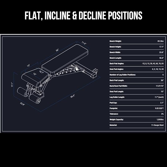 - Specifications - Bench Weight: 89.3lbs | Bench Height: 17.1” | Bench Width: 25.8” | Bench Length: 56.6” | Back Pad Angles: -12, 0, 15, 30, 45, 60, 70, 85 | Seat Pad Angles: 0, 5, 10, 15, 20 | Number of Leg Roller Positions: 6 | Back Pad Length: 36” | Back/Seat Pad Width: 11.8”/15” | Seat Pad Length: 15” | Leg Roller Length: 7.7” (each) | Pad Gap: 2.1” | Footprint: 9.85 | SQFT Tolerance: 3% | Weight Capacity: 1,000lbs | Material: 11-Gauge Steel