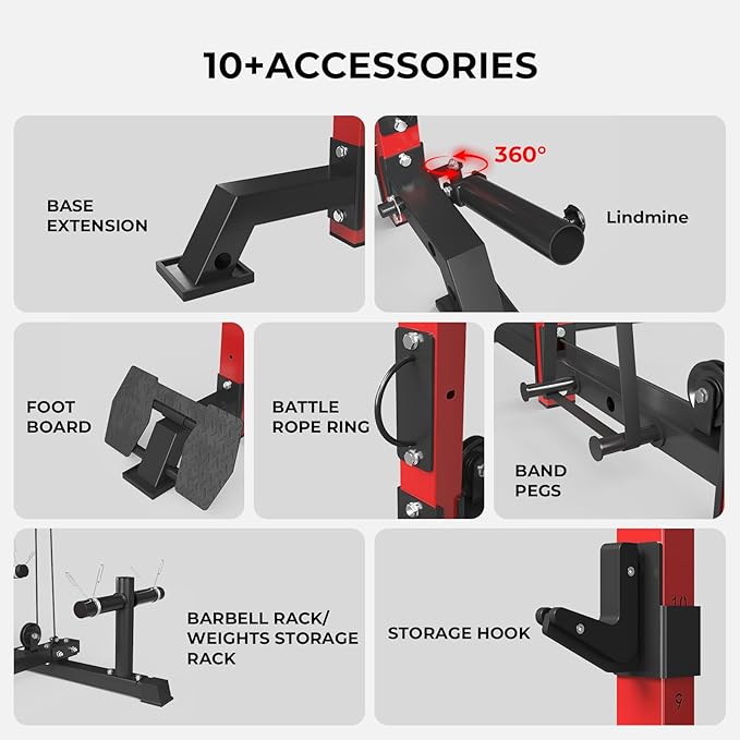 - 【Free Accessories】Say goodbye to the hassle of buying additional fitness accessories. The PC03 comes with a wide range of free accessories included. You'll receive a lat pulldown bar, tricep rope, cable bar, multi-position cable handles, 500lbs J-Hooks, 500lbs safety catches, wide/narrow dip bars,and a footboard, a battle rope ring, and a weight/barbell holder. Everything you need to enhance your workout experience is right at your fingertips.