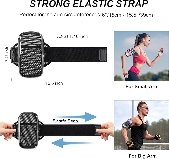 - 【 Adjustable for Small-Big Arm 】Sports arm band with elastic band, it is adjustable for a one size fits most feel, Suitable for arm circumferences of 10 inches to 16 inches (26-40 cm), allowing it to fit a variety of users, as well as over clothing or bare skin for a tight and secure fit - soft-touch material will not rub or chaff