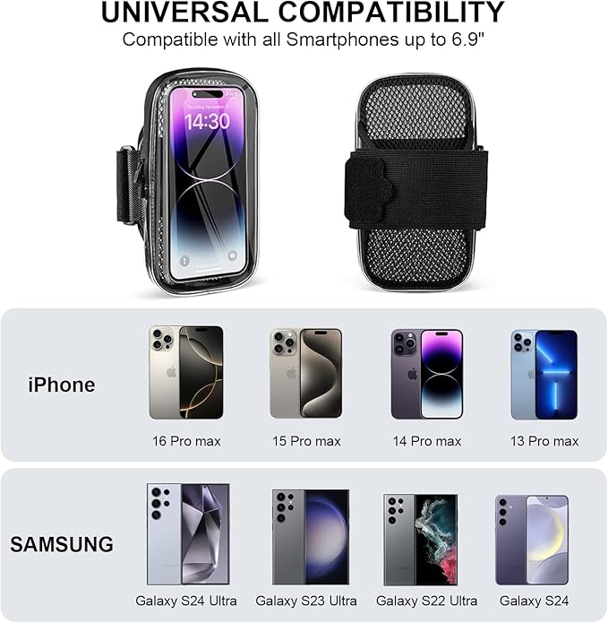 - 【 Universal Phone Armband Case 】Running Phone Holder Armband can fit cell phone up to 6.9 inches, fits iPhone 16,15,14, 14 Plus,14 Pro, 14 Pro Max, iPhone 13, 13 Pro, 13 Pro Max, 12, 12 mini, 12 Pro, 12 Pro Max, 11, 11 Pro, 11 Pro Max, XS Max, XR, XS, X, 8, 7, Samsung Galaxy S22 S21 S20 FE, S20+, S10+, Note 20 10 A71 A52; Built-in a small pocket allows enough room for credit/ID cards, cash and key slot