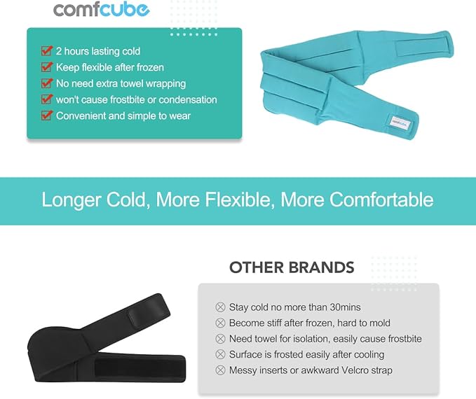 - Ultra Long Lasting Coldness - Comfcube migraine relief ice pack adopts patent ice cube technology to stay cold up to 2 hours, and always keep a low temperature at which your skin feels comfortable, no need extra towel wrapping and won't cause frostbite or collect condensation.