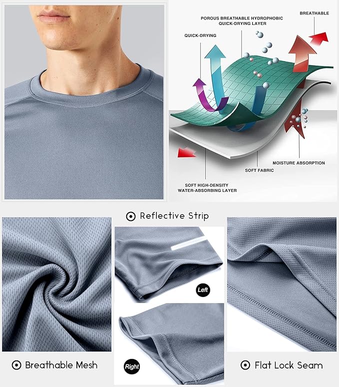- DESIGNED FOR COMFORT - These moisture wicking gym tee shirts are made with comfort and performance in mind; We combine a non-restrictive crew neck with short sleeves to bring you men's athletic performance shirts that deliver more flexibility and a wider range of motions