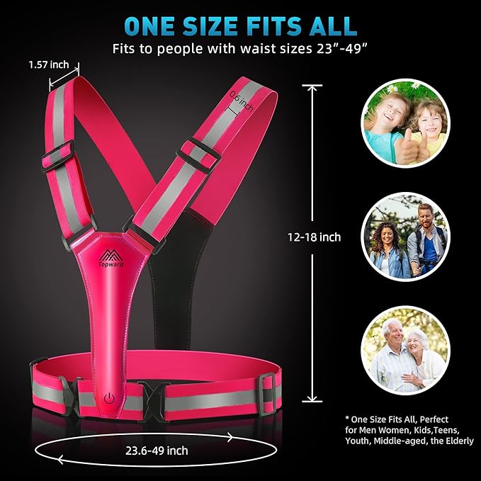 - COMFORTABLE & ELASTIC & ADJUSTABLE - The ergonomic design of this LED reflective vest ensures your comfort when you wear it over any dress typically t-shirt, sports gear, jacket as per the season. Waist circumference expands from 23" to 49"; Shoulder strap: 12 - 26 inch; perfect gift for men/women/kids/teens/the elderly