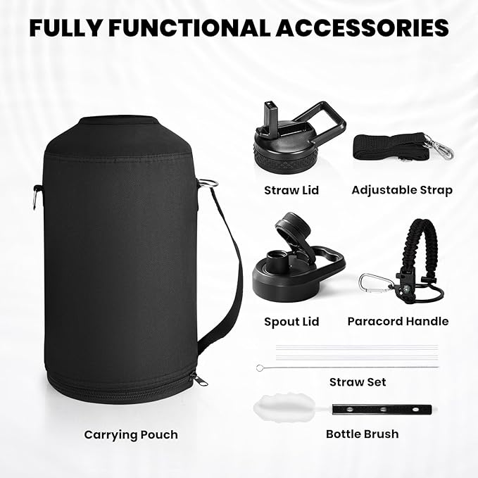 - What You'll Get: We offer Continuous After-sales Service and 100% customer satisfaction against any leakage or insulation failure. You purchase contains: RAYMYLO 64oz/128oz Water Bottle, Carrying Pouch, Straw Lid with 2 Straws & Straw Brush, Spout Lid, Paracord Handle, Bottle Brush