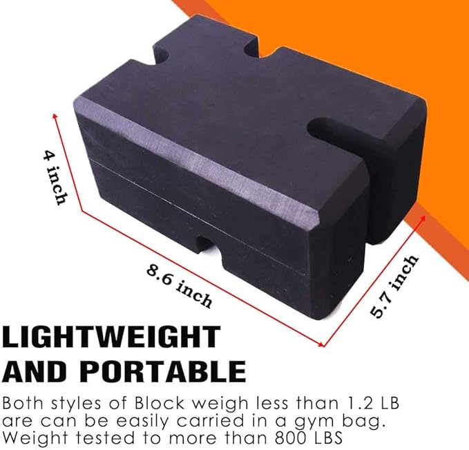 - LIGHTWEIGHT and PORTABLE: Both styles weigh less than 1 lb and can be effortlessly carried in a gym bag. These blocks have been weight tested to support loads exceeding 800 lbs.