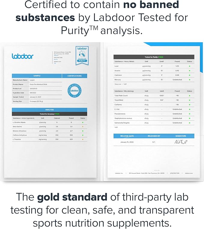 - Tested for purity and potency in an ISO 17025 accredited third-party lab, and independently certified to contain no contaminants or banned substances by Labdoor. Every bottle of our Pulse pump pre workout is guaranteed to provide exactly what the label claims and nothing else.