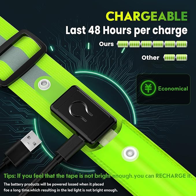 - ๐ PARAMETER - Reflective gear visible range:800 feet; LED Light visible range:1200 feet; Charging time:2 hours; Lighting time:5-8hours; Weight: 100g