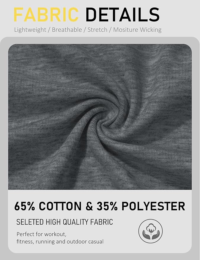 • Soft, Lightweight, Breathable, Stretchy.(Solid color is pure cotton while heather color is 65% cotton & 35 polyester)