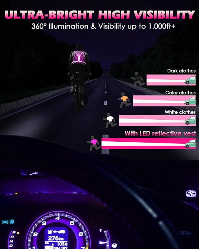 - 【Stay Safe, Stay Visible with High Visibility】: This LED reflective vest uses top-tier LED lights and reflective strips, 360° lighting at night to ensure your safety, even in the harsh environment of 1000 feet away. And keeping you seen and safe during low-light outdoor activities with the reflective running vest