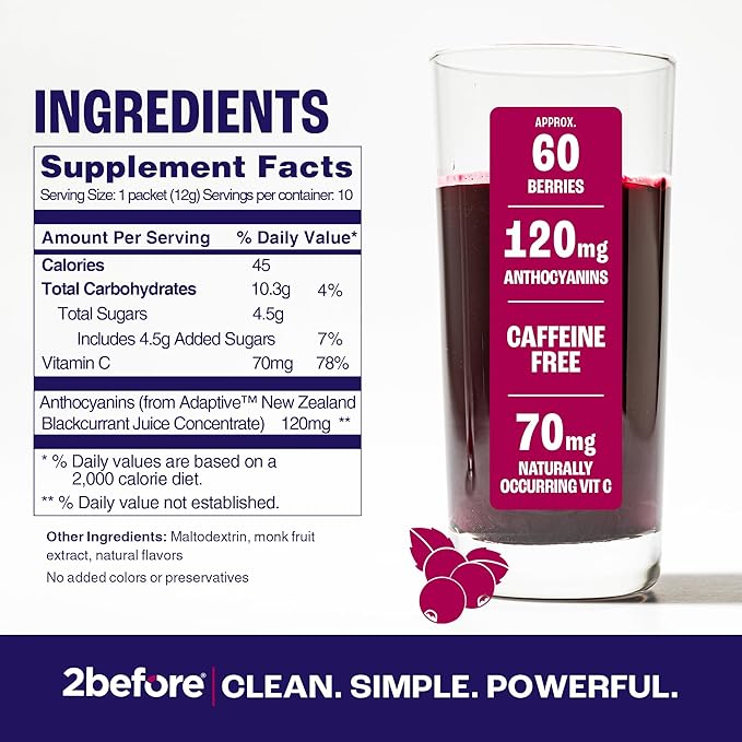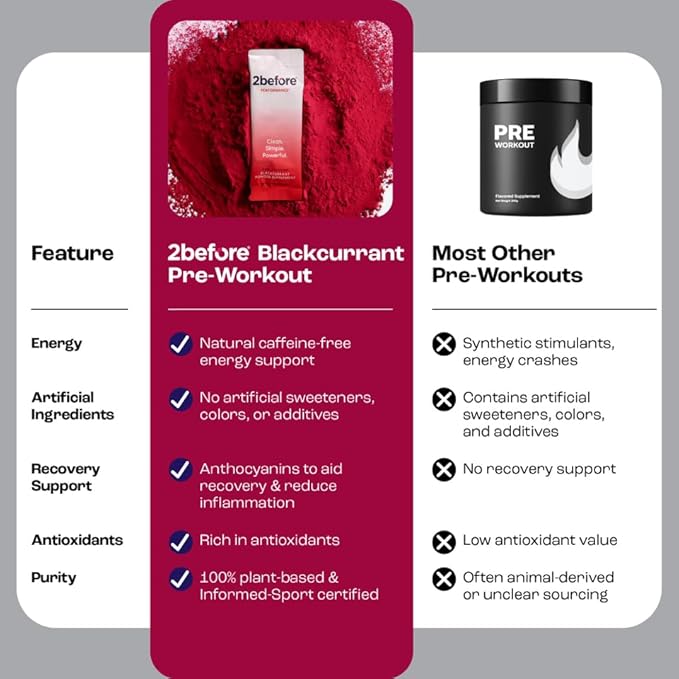 - MORE ENERGY + ENDURANCE: Blackcurrants improve athletic performance by 4.6%, aiding circulation and faster muscle recovery. "I took 34 minutes off my marathon PR after incorporating 2before" - JR – Marathon Runner