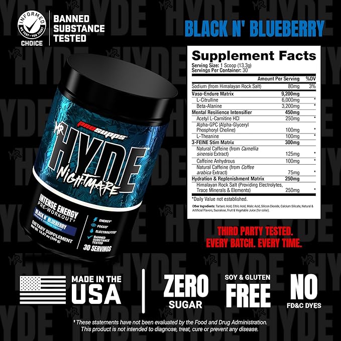 - Your Competition’s Worst Nightmare: ProSupps Mr. HYDE Nightmare is a pre-workout powder formulated for high-performance athletes who want to push past their limits. Formulated for intense energy, sharp mental focus, and elevated performance endurance for those who never back down. Black N’ Blueberry flavor. 30 servings. 300mg caffeine/serving.