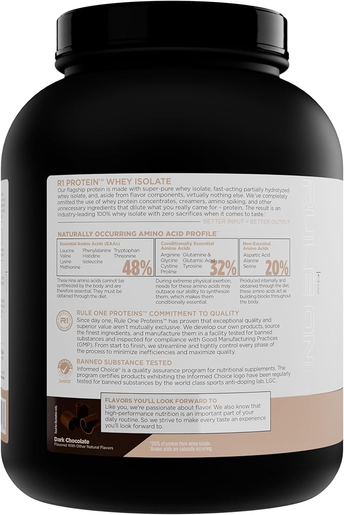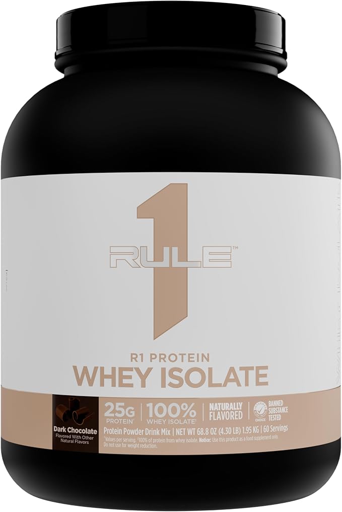 Rule 1 Naturally Flavored R1 Protein Whey Isolate - Clean Formula with 25g Protein & 6g BCAA Exclusively Isolated & Hydrolyzed Sources for Workout Recovery (4.3 Pounds*, Dark Chocolate)
