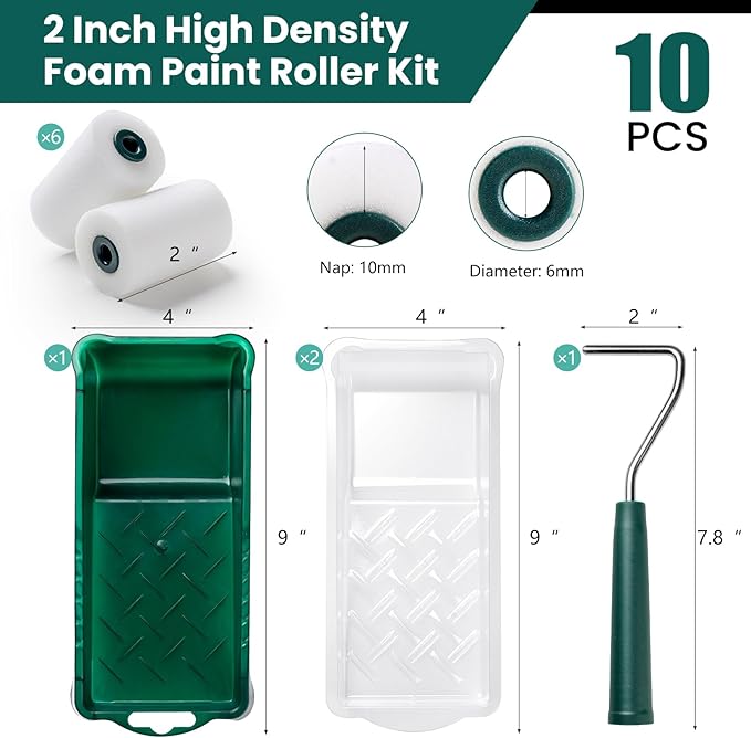 - 2“ Foam Paint Roller Kit: 2” density foam paint roller cover*6, 2“paint tray*1, 2“ liner*2, 2“ paint roller frame*1. The 2-inch paint roller set is versatile and can be used for various painting projects.