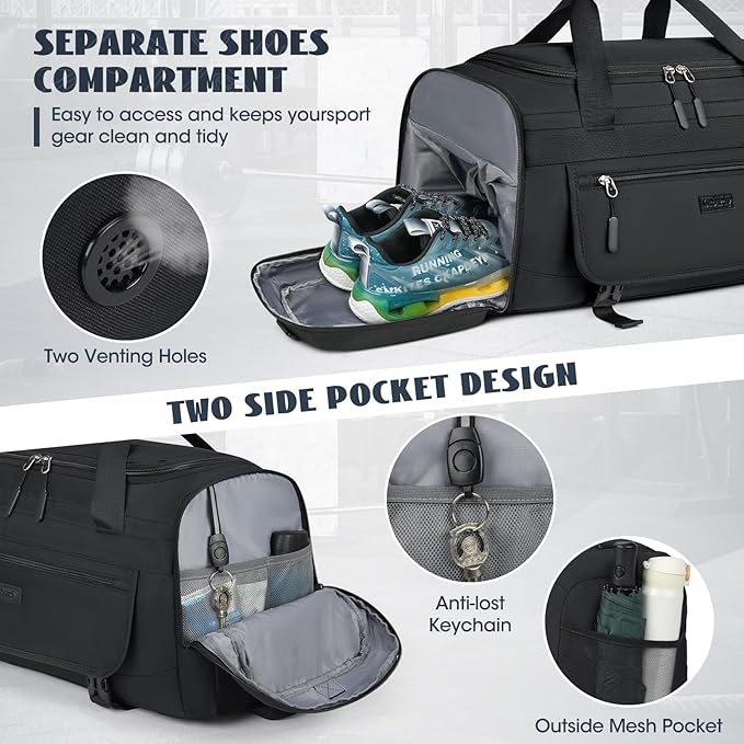 - 【Spacious Duffle Bag】Gym bag is designed with practical structure. ➤1 main compartment with double zippers can hold all essentials,it also feature 1 large mesh pocket,1 zipper pocket and 1 small mesh pocket to keep your stuff more organized.➤1 wet pocket on the back of gym bag➤the side of gym bag has 1 separate shoe compartment,1 zipper pocket with a an anti-lost keychain, 1 mesh pocket.➤1 zippered front pocket.Also features with two buckle straps on the front to hold your extra sports gear.