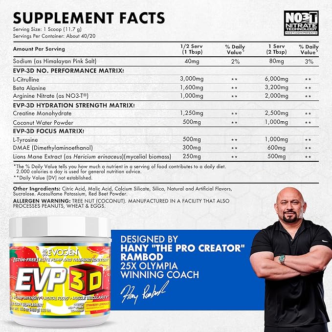 - DESIGNED BY THE PRO CREATOR – Developed by Hany Rambod, 25X Olympia-winning coach, EVP 3D is a clean pre workout built on cutting-edge science to maximize pump, mental focus, and recovery so you can train like a champion.