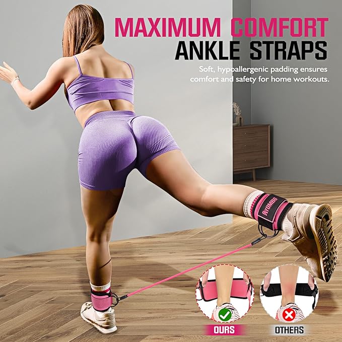 - Unmatched Comfort and Safety: Our Ankle Resistance Bands are designed with your comfort and safety in mind. The ankle strap is equipped with a premium quality sponge for ultimate comfort during your workouts. The neoprene ankle pad ensures a secure and comfortable fit, while the double D-ring provides extra stability and peace of mind for your legs and glutes training