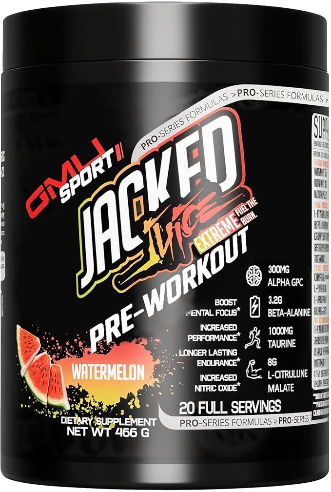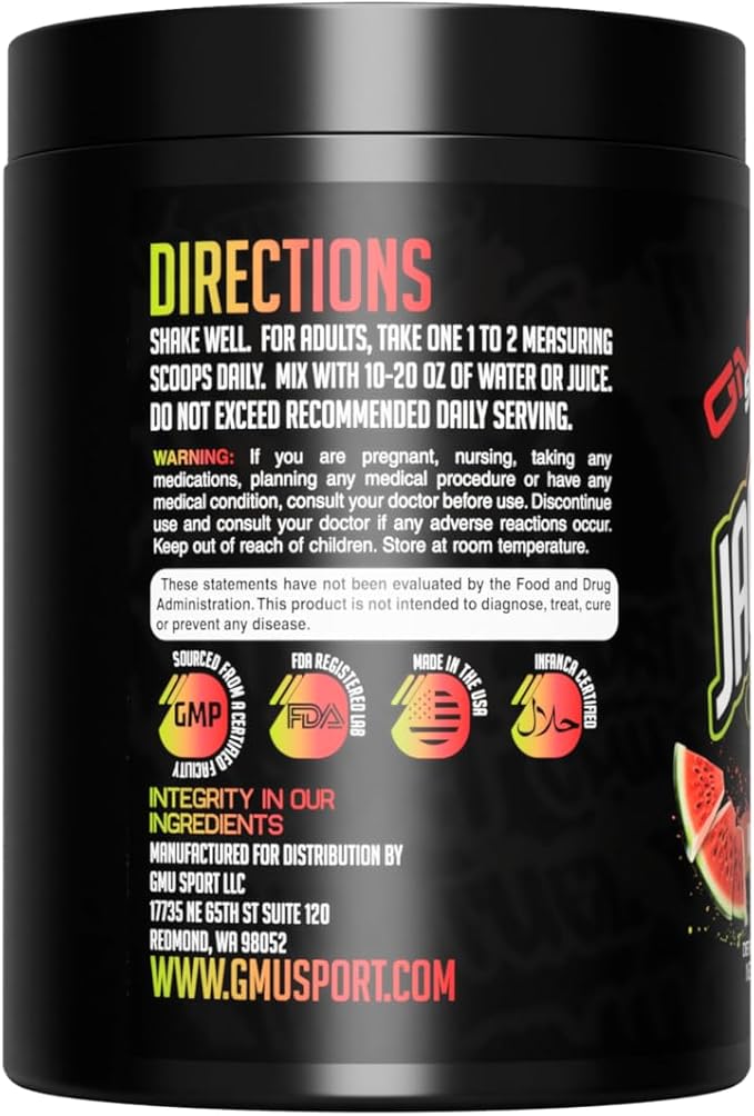 GMU SPORT Jacked Juice Pre Workout | Explosive Energy, Focus & Muscle Pumps | 8g Citrulline Malate, 3g Creatine, Beta Alanine, Alpha-GPC | 250mg Caffeine | 40 Servings Watermelon