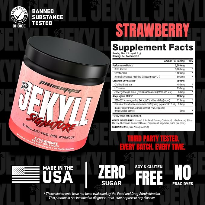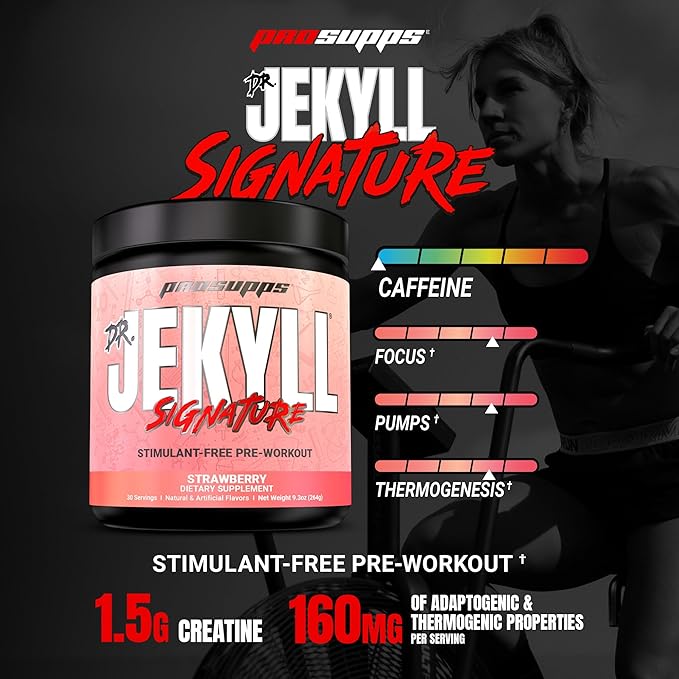- Crush Every Workout with JEKYLL: ProSupps Dr. JEKYLL Signature is a pre-workout powder designed to boost strength, focus and endurance with ZERO caffeine. Developed with trusted ingredients to help anyone from all fitness levels. Strawberry Flavor. 30 servings.