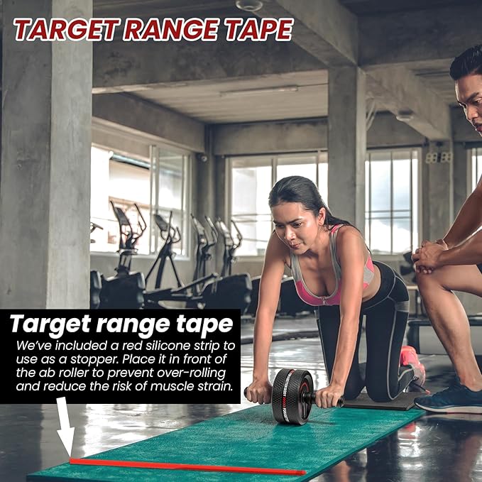 - 【Target Range Tape】: We have specially provided you with a red silicone strip (we call it the "Target Range Tape"), When you use the exercise wheel for indoor fitness, the position of the silicone strip can be used as your goal, it will block the role of the roller, you can gradually expand the distance with the silicone strip has achieved the purpose of gradual progress.