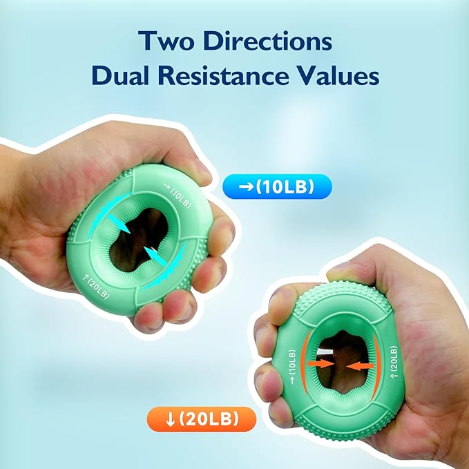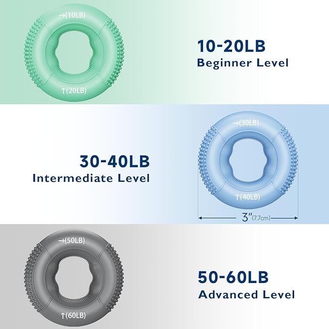 - ๐๐ผ๐ป๐ด-๐น๐ฎ๐๐๐ถ๐ป๐ด & ๐๐น๐ฒ๐ ๐ถ๐ฏ๐น๐ฒ ๐๐ฟ๐ถ๐ฝ ๐ฅ๐ถ๐ป๐ด๐: Advance your hand strength with our progressive hand gripper rings, offering adjustable resistance from a gentle 10-20LB to a tough 50-60LB. Each ring is made from premium food-grade silicone, ensuring lasting elasticity and shape retention. The non-slip textured surface provides a secure and comfortable grip.