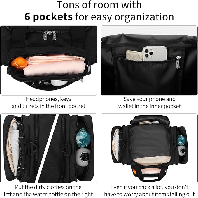 - 6 POCKETS & ROOMY: Great weekender bag is lightweight for easy carrying, has ample room but is not overly large. It has 1 main large compartment, 1 inner pockets, 2 side pockets, 2 front pockets to organized things more easily.