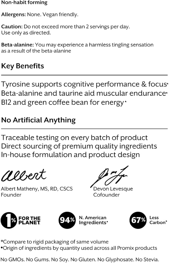 - Maximize Focus + Performance: Promix Pre-Workout Powder features tyrosine for increased focus, beta-alanine and taurine for improved endurance, and B12 and green coffee bean for enhanced clean energy. Non-habit forming and mixes instantly. Real Lemon flavor. 2 scoops per serving, 30 servings per container.