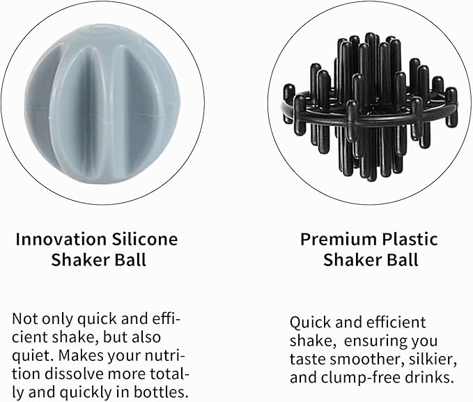 - 【INNOVATIVE SHAKER BALLS】The package includes 2 shaker balls. The Innovation silicone shaker ball is quiet and efficient, without noise, easy to clean, not easily damaged. The plastic shaker ball is quick and efficient to shake. You can choose which shaker ball to use according to different occasions and needs. 2 shaker balls ensure that all powdered additions are mixed up smoothly without lumps.