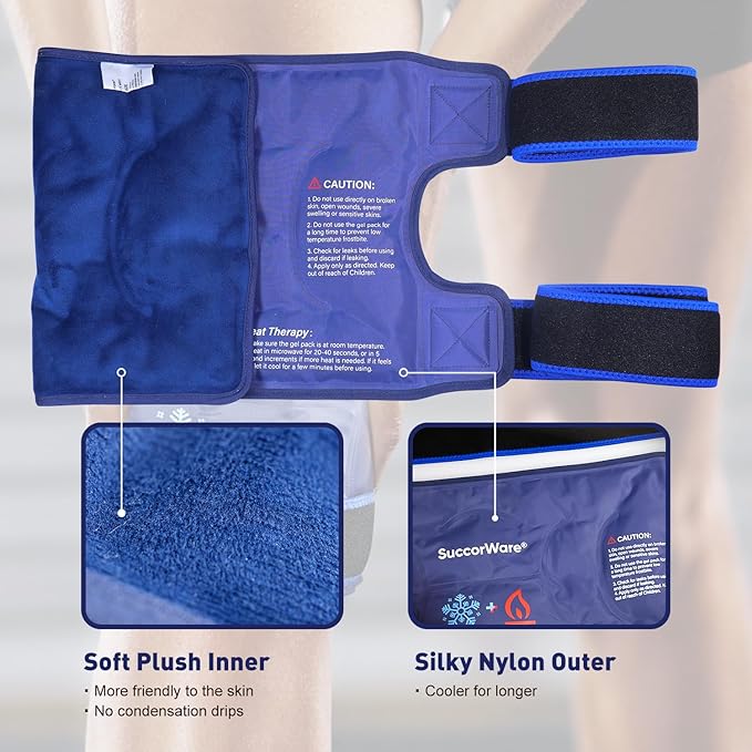 - FULL COVERAGE AND PAIN RELIEF - SuccorWare knee ice pack wrap features a brand new design that fully wraps around the entire knee for pain relief. Equipped with adjustable straps to fit different leg shapes and ensure a firm fit of the knee hot/cold pack without interfering with daily activities.