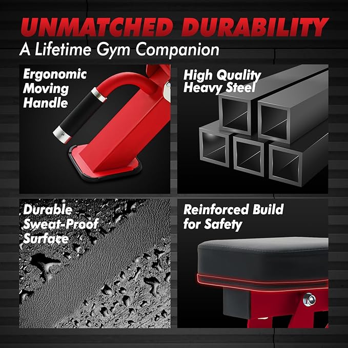 - Simple Assembly and Transport: With a pre-assembled hinge mechanism and quick-install design, setting up this bench is a breeze. Transport wheels add mobility, making it simple to move and store anywhere.
