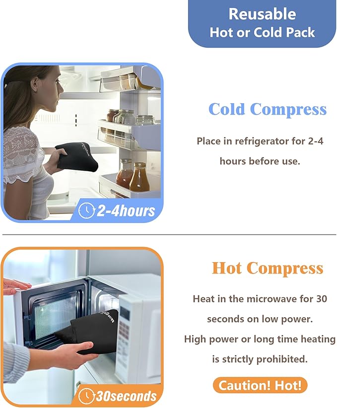 - HOT OR COLD THERAPY: Leave it in the fridge for 2 hours or microwave it for 30 seconds to apply soothing heat - the flexible gel retains temperature well for targeted therapy.