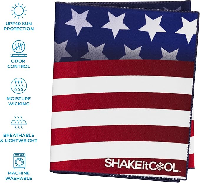 SHAKEitCOOL Extended Size Cooling Towel โ Be Cool in Style - Heat Relief, Soft, Lightweight, Sun Protection, Easy Clean - Perfect for Biking, Hiking, Running, Yoga, Golf, Gardening - Wavy Flag M