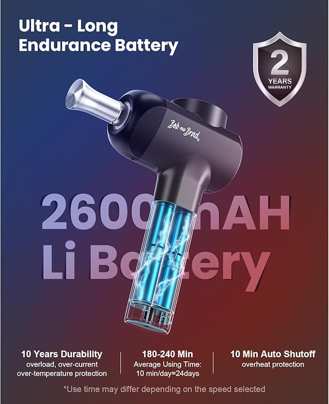 - 5-Customizable Massage Experience: The ability of this Bob and Brad heat and cold massage gun to tailor the massage experience with adjustable 5 speeds of rpm(2000,2300, 2600, 2900, 3200) for a more personalized approach to muscle recovery. The extended long ergonomic handle of 9.5inches design and weighs only 1.9 pounds for ease of use.