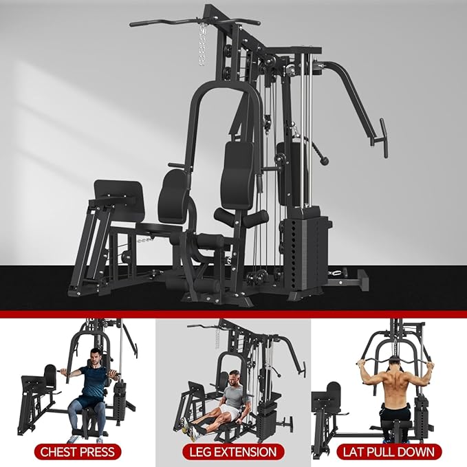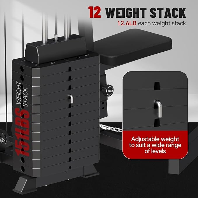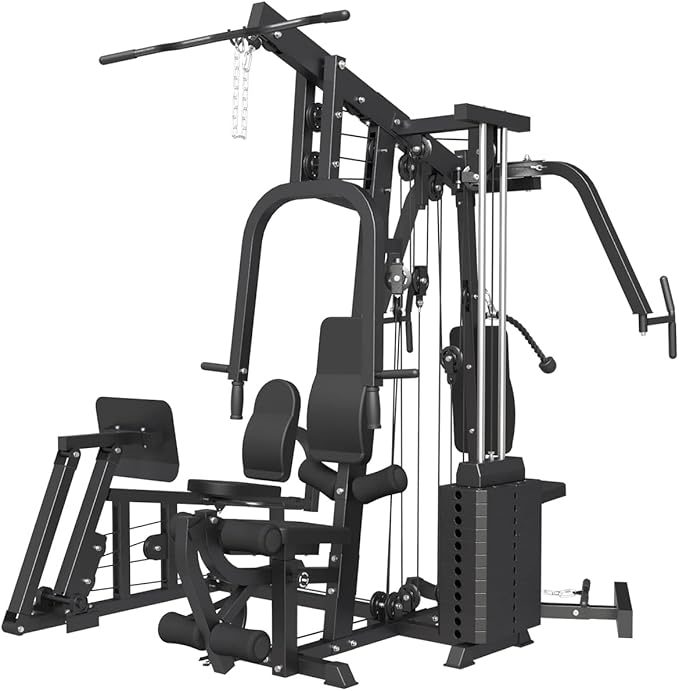 - FULLY CUSTOMIZABLE HOME GYM: This single-stack home gym features a revolutionary no-cable change design, complete with a lat pull-down bar, low row bar, leg press bar, an abdominal harness with multi-position handgrips, and adjustable hold-down pads, enabling you to target and tone various muscle groups throughout your body.