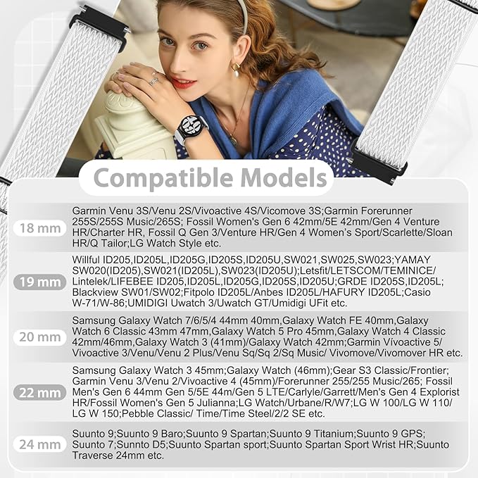 - 【22mm Compatible Models】22mm watch bands fit for all traditional watch and smart watch with 22mm width watch lugs,such as Samsung Galaxy Watch 3 45mm,Galaxy Watch 46mm,Gear S3 Classic/Frontier;Garmin Venu 3/Venu 2/Vivoactive 4 45mm/Forerunner 570 47mm/255/265; Amazfit Bip 6/5,Balance/Cheetah,GTR 4/GTR 3 Pro/GTR 3/GTR 2/GTR 2e/GTR 47mm; Huawei Watch GT 5 46mm/5 Pro 46mm/4 46mm/3 46mm/3 Pro 46mm/2 46mm/2 Pro/GT 46mm/GT 2e 46mm;Xiaomi Redmi Watch 5 Active/5 Lite,Xiaomi Watch S3/2 Pro/2 etc.