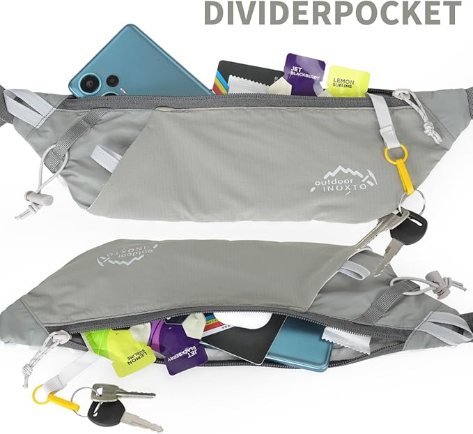 - ❤【Large Main Compartment Capacity】The Inoxto Running Belt Fanny Pack is a lightweight running waist pack that weighs only 200 grams. Its main compartment is designed to be spacious and can store mobile phones, tissues, keys, cash, cards, sports products, etc. This product is suitable for most smartphones with screen sizes below 6.6 inches, ensuring that users can conveniently carry essential items during exercise and enhance their exercise experience. Its lightweight nature makes running, fitness and other activities more comfortable without causing any burden.