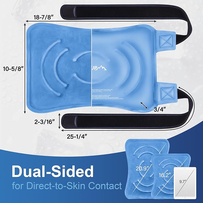 - [COMFORT FIT] Measures 19" x 10.6" and weighs 2.43lb, filled with more gel, the knee ice pack wrap has soft plush lining for comfortability and two 25" lengths of elastic straps to ensure that stays securely in place and free your hands. It can be used on various body parts including the knee, shoulder, back, elbow, leg, and ankle. (PLEASE NOTE that the straps are not long enough to wrap around the entire waist)