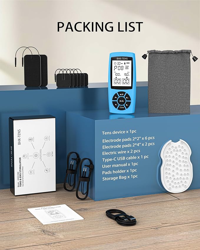 - [22 Programs & 40 Intensity] - The BHK-TENS muscle stimulator is equipped with 2 output channels and 22 programs, also designed with 40 intensity levels, offering you more options for relief therapy without shock feelings. Different programs use different pulse rate (Hz) and width (uS), you can find them on screen, so can easily find the most suitable program and intensity for needs. Your physiotherapist may recommend it to you.