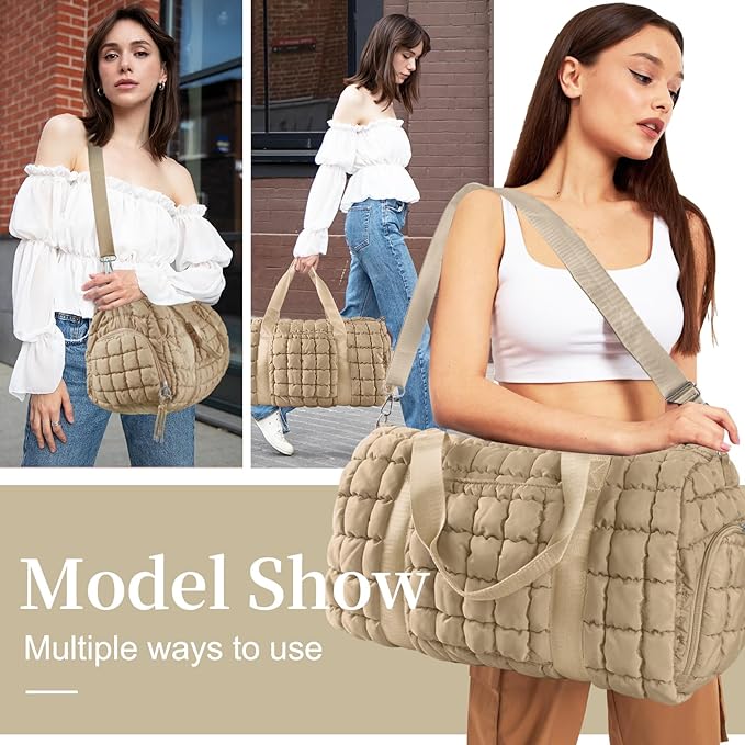 Quilted Travel Duffle Bag Gym Bag for Women,Large Puffer Duffle Weekender Bag with Compartment,Workout Overnight Carry on Organizer Bag Duffle Bag for Airplane Travel(Khaki)