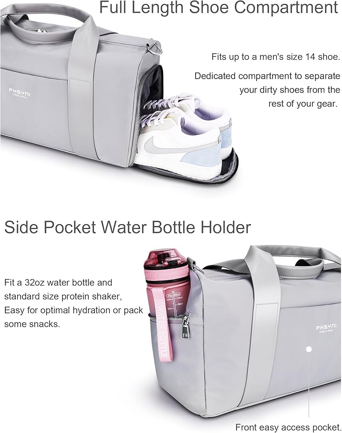 - Gym Bag with Water Bottle Holder & Leak-proof Wet Pocket - Roomy wet pocket made of water-proof coated material, easy to clean, hold your toiletries, wet socks, towels, and body wash (a necessary thing when you're packing a bag of sweaty clothes every day). Plus dedicated shoe compartment to separate your dirty shoes, Fits up to a shoes size 14