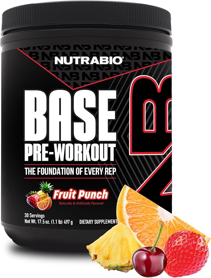 NutraBio Base Pre-Workout Powder 200mg Caffiene, Sustained Energy, Focus, Endurance, Pump, Sugar Free, Clean Preworkout for Men and Women - Beta Alanine, L-Tyrosine, 30 Servings - Fruit Punch