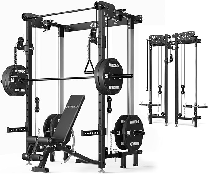 - [ALL-IN-ONE MACHINE]: This ingenious machine seamlessly integrates a power rack, cable crossover machine, lat pulldown machines, pull-up bar, and more into one sleek unit. With five adjustable settings - folded, semi-open, power rack, functional trainer, and cable crossover machine - you have the versatility to tackle any workout.