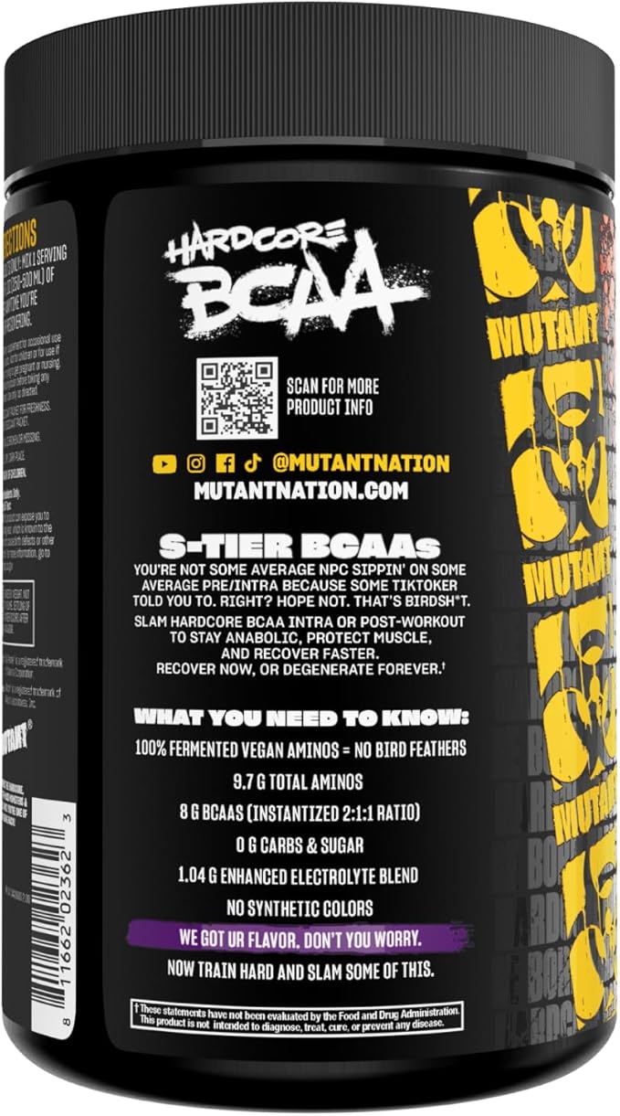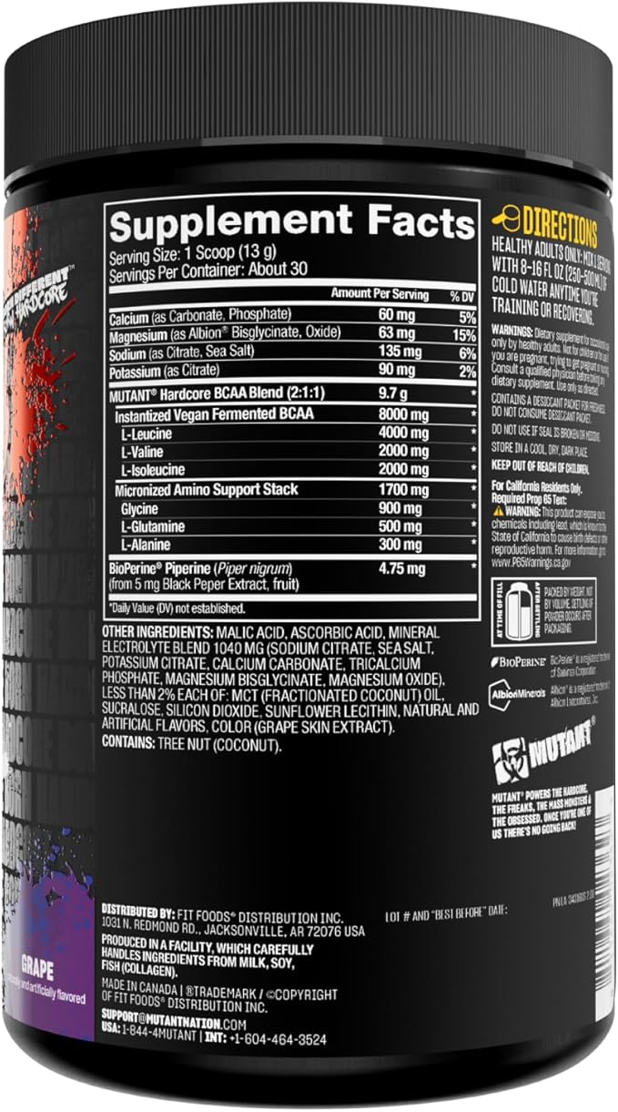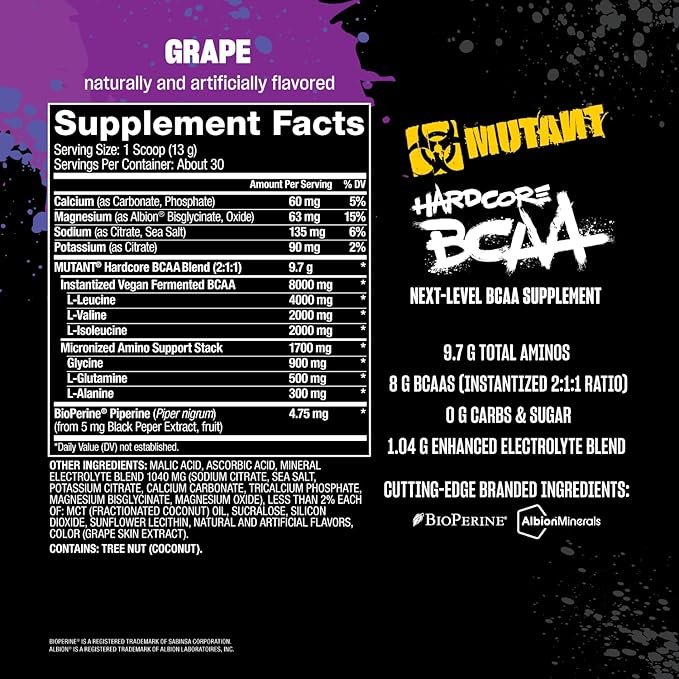 Mutant Hardcore BCAA - Pre, Intra or Post Workout – BCAA Next Level branched-Chain Amino Acids Supplement – Hydration + Recovery - 30 Serving - Grape