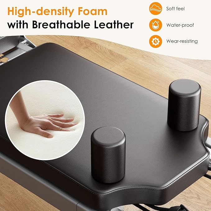 - EASY CARE- Surface material of the pilates equipment is superior UP leather, which is anti-scratch, non-staining and waterproof, and will look brand new after long-term use with just a wipe. In addition,if you meet any problem about the reformer,please contact us first and we will offer solution for you.