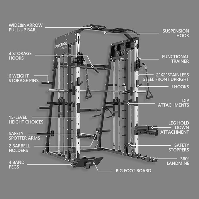 - The power cage that meets all your fitness needs! Smith machine, cable crossover, and pull-up station. Enjoy unlimited exercises in limited space, including pull-ups, barbell squats, shoulder presses, and cable chest fly. Pre-drilled holes for resistance bands add even more versatility
