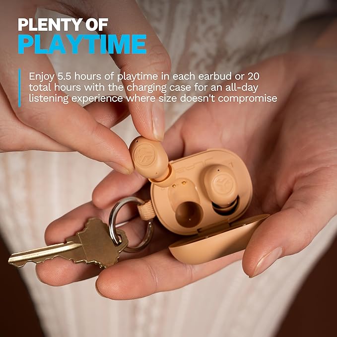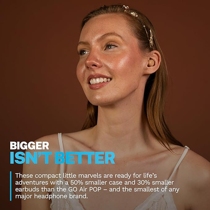 - ๐ค BIGGER ISNโT BETTER / PLENTY OF PLAYTIME: These compact little marvels are ready for lifeโs adventures with a 50% smaller case and 30% smaller earbuds than the GO Air POP โ and the smallest of any major headphone brand. Enjoy 5.5 hours of playtime in each earbud or 20 total hours with the charging case for an all-day listening experience where size doesn't compromise performance.