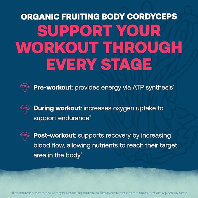 - KEY INGREDIENTS - Organic fruiting body cordyceps mushroom have been used for energy production, oxygen utilization, and muscle recovery. Studies show Cordyceps may improve the way the body uses oxygen, especially during exercise.